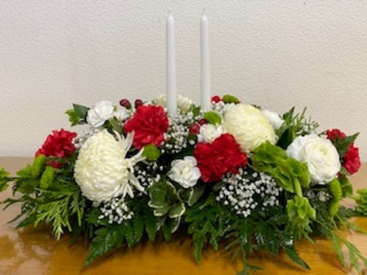 A Christmas dining table is not complete without a flower arrangement to add to the season's festive feel! Our Christmas Table Topper arrangement can be customized to match your decor/colors. Be it the traditional flower colors of red, green & white (as shown) or something else, just let us know. We love creating pieces for your style. 2 candles are included with this arrangement.
