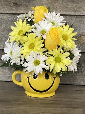 What a great arrangement to put a smile on someone's face. Nice for a Get Well, Thinking of You or just to Brighten someone's day. This one sided mixed flower arrangement and varies on availability using premium blooms of bright colors.