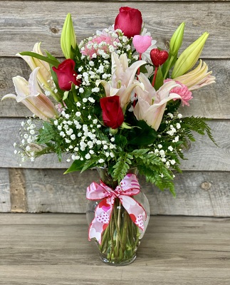 Our Valentine's Designers Choice Mixed Vase is the perfect choice! With a little bit of everything you can't go wrong. Let our Designers put together a custom Valentine's vase just for you! Features, roses, lilies, mums, carnations, daisies and filler flowers. **NOTE** This is a DESIGNERS CHOICE vase, so your design will differ from the example pictured here!** Available in multiple sizes, to fit any budget!